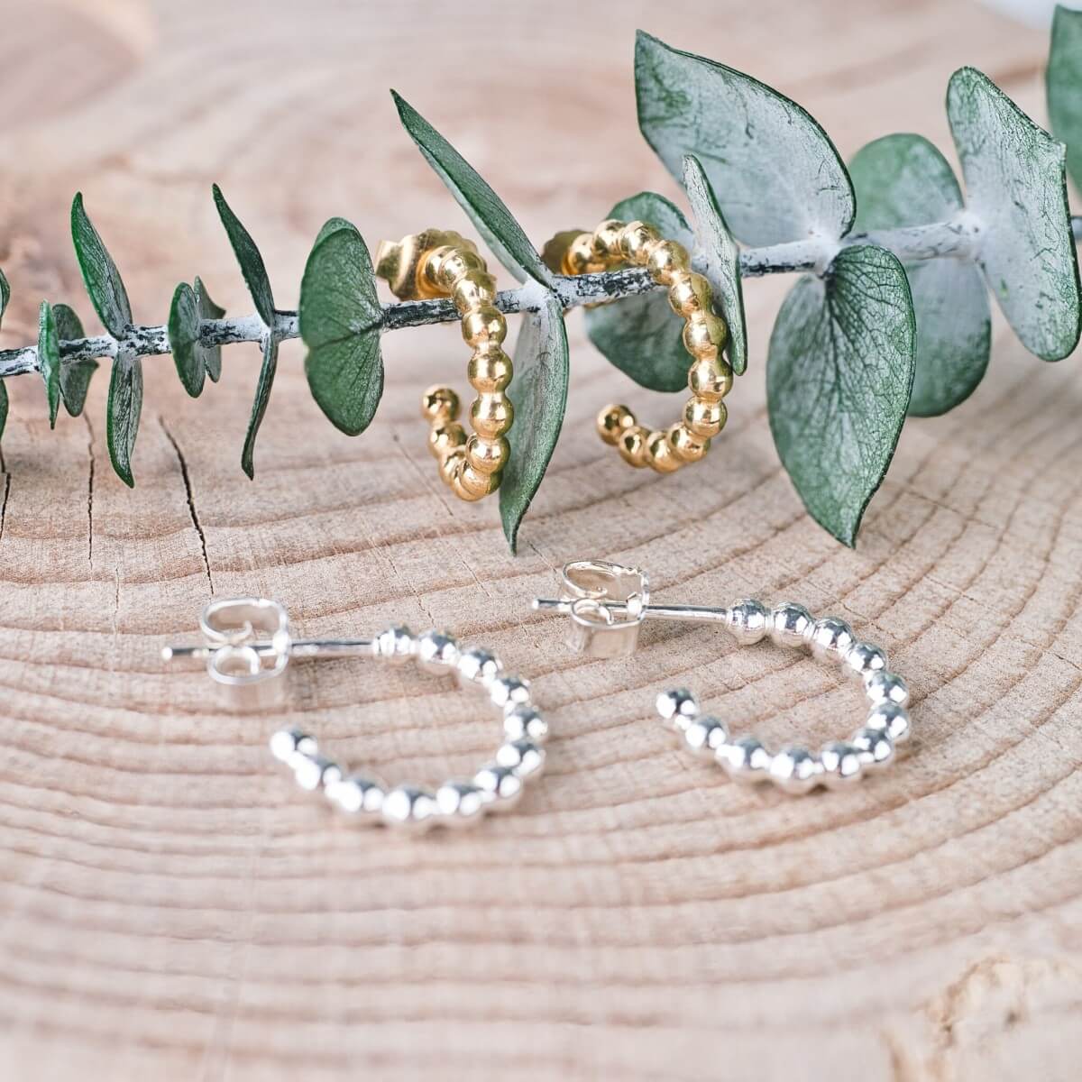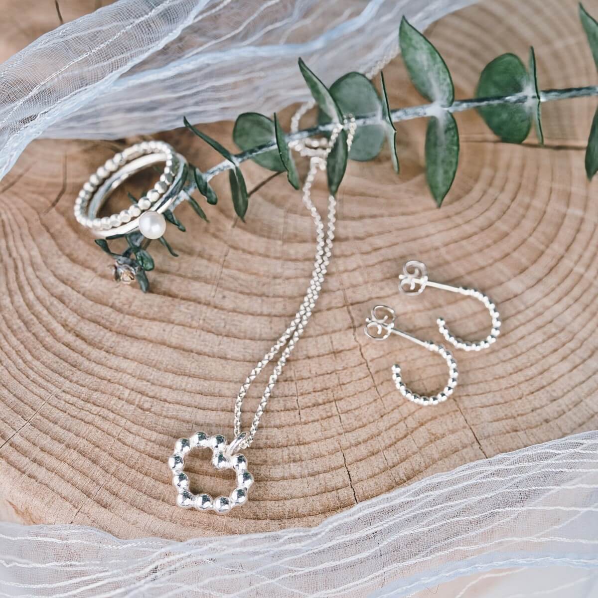 Zusteckringe, Anhänger und Ohrstecker aus Kugeldraht in Edelmetall.