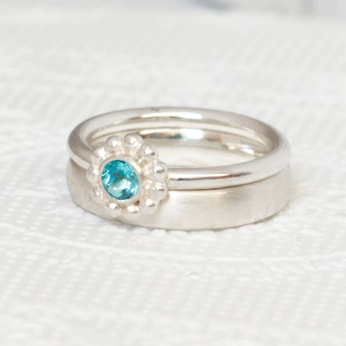Aus verschiedenen Ringen, z. B. mit einer Edelsteinkugel kann man sich seine Lieblingskombination zusammenstellen. Oder auch nur einen einzelnen Ring als Zusteckring zum Ehering tragen.